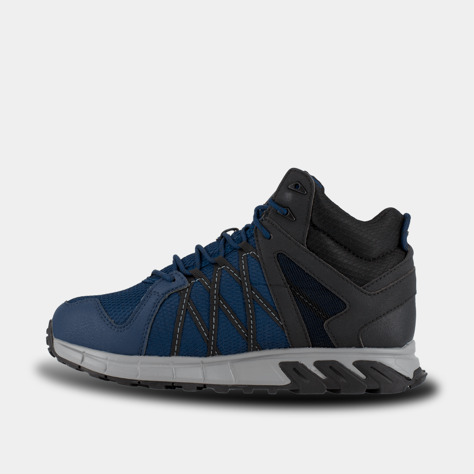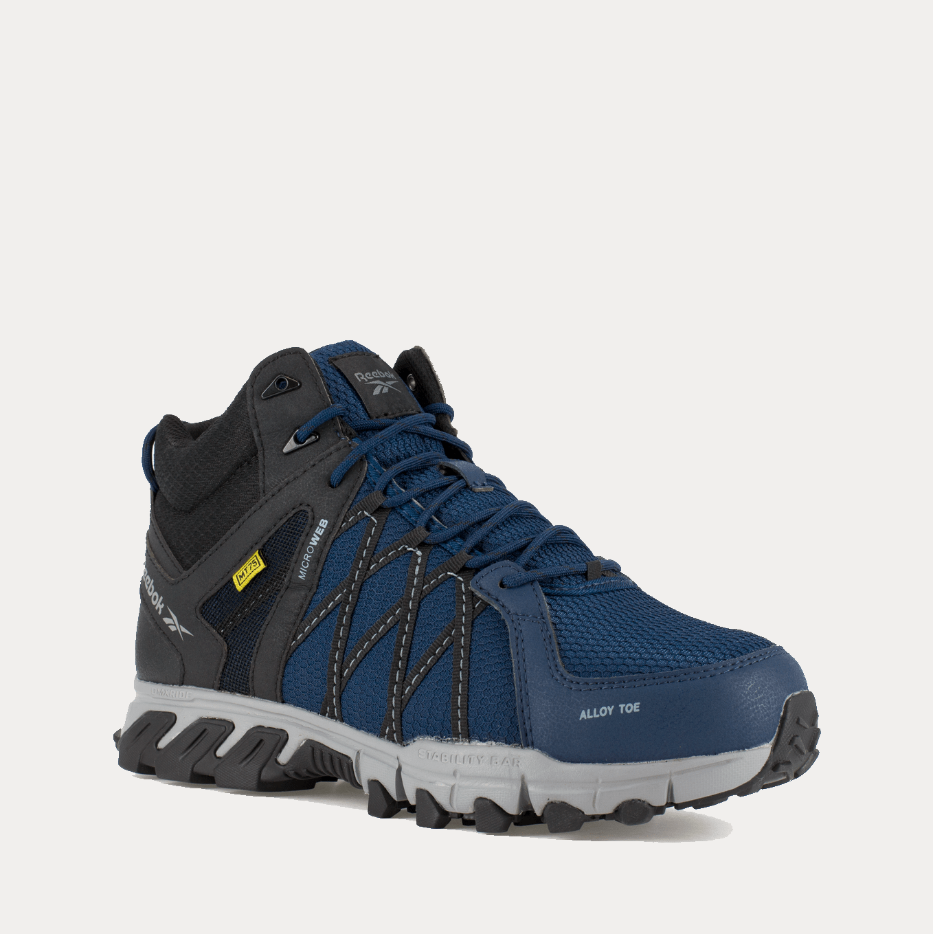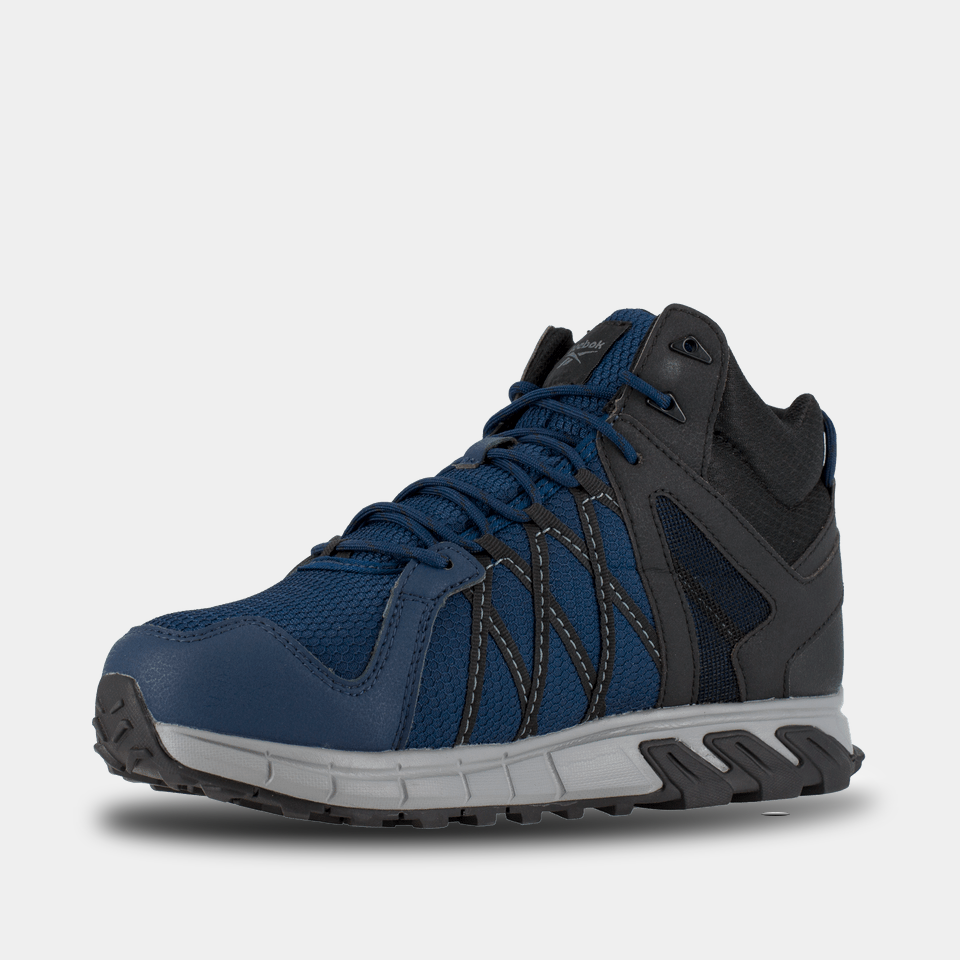 Charge through work with the Reebok Trailgrip athletic mid-cut work boots, featuring an active traction rubber lug pattern with outstanding gripping power. A MicroWeb lacing system keeps your foot locked in with lateral stability. The MemoryTech Massage footbed on these Reebok alloy toe boots adapts to the contours of your foot. The alloy toe and CushGuard™ Internal Met Guard meet or exceed ASTM F2413 safety standards.