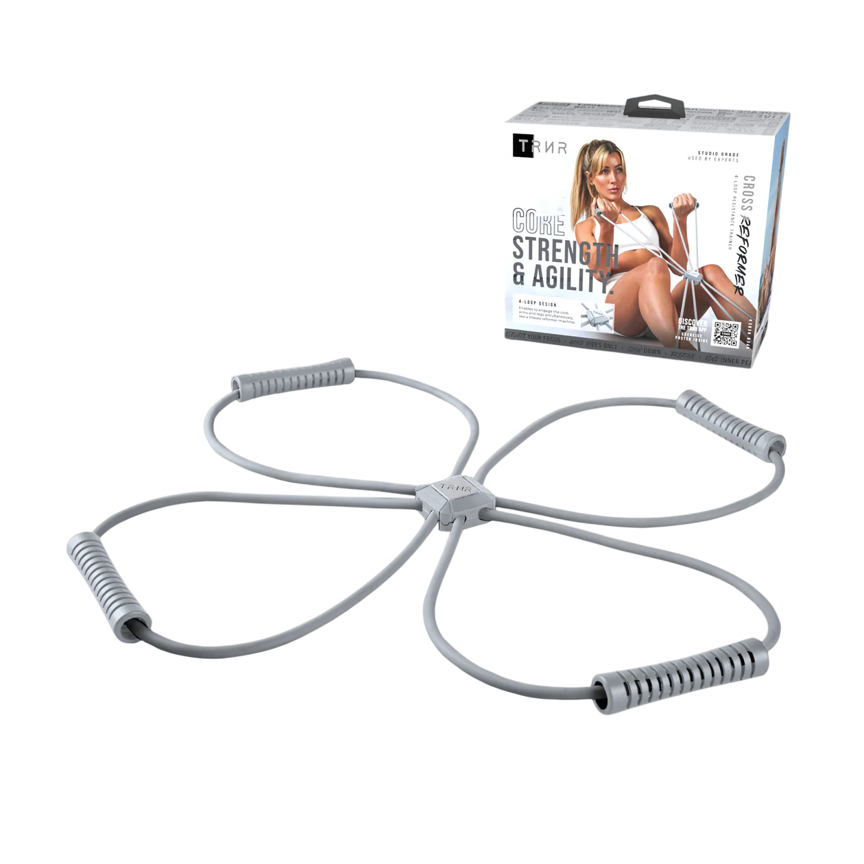 Introducing the TRNR Cross Reformer – your innovative solution for a full-spectrum Pilates workout, reimagined. This cutting-edge fitness tool is ingeniously designed to encapsulate the core resistance principles of a classic Pilates reformer machine, all through the use of X-shaped, lightweight resistance bands. With the TRNR Cross Reformer, you can now enjoy the full benefits of Pilates reformer exercises with a modern twist, bringing a dynamic edge to your fitness regimen. At the heart of the TRNR Cross Reformer's design is the unique 4-loop system. This intuitive feature allows for simultaneous engagement of your core, arms, and legs, providing a balanced and comprehensive workout that echoes the integrated resistance of a traditional Pilates reformer. With each movement, you’ll experience a seamless blend of toning, strengthening, and elongating exercises that will redefine your body from the inside out.