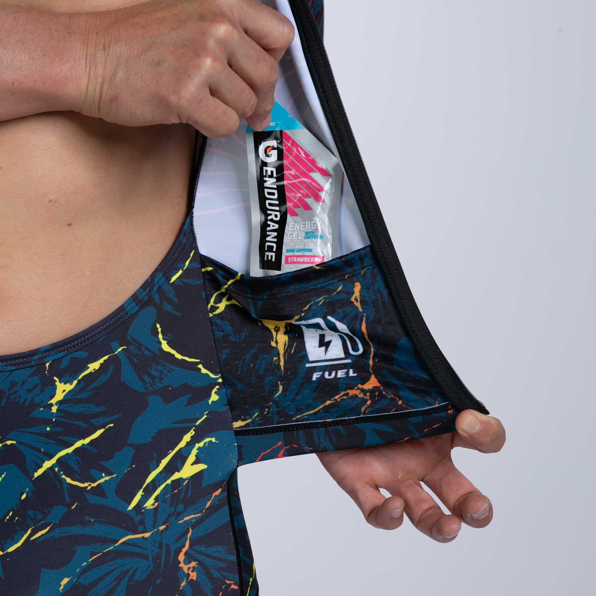 Balanced in aerodynamics and comfort, you'll appreciated the newly updated LTD Tri Aero Full Zip Racesuit. Internal ice pockets keep you from running too hot, while the nutrition pocket provide secure storage for all of your nutritional needs. The longer, more aerodynamic set in sleeves that reduce wrinkles to increase speed. The dimpled structure of Vento Aero fabric is placed in critical areas of the racesuit to reduce the vortex of air which is generated behind the athlete and, consequently, reduces drag and saves watts. The full zip design allows for quick and easy pit stops.